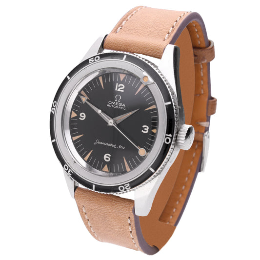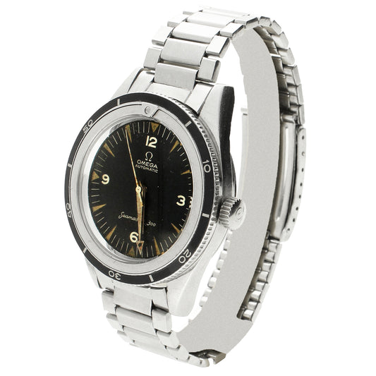 Stainless steel OMEGA '1st Generation' Seamaster 300 automatic wristwatch with enamel bezel. Made 1958
