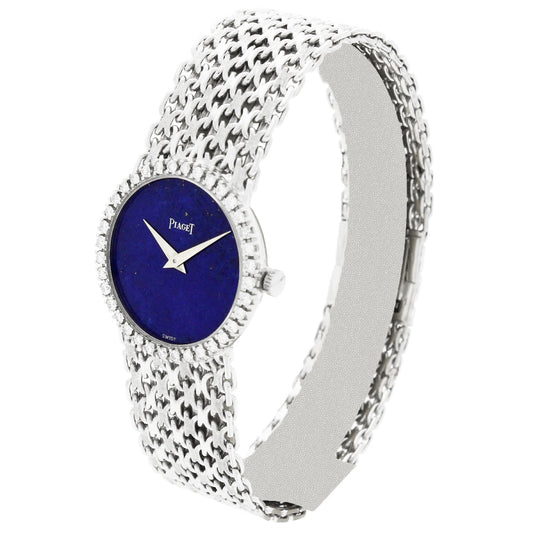 18ct white gold Piaget ref. 9706 bracelet watch with lapis lazuli dial and diamond set bezel. Made 1970's