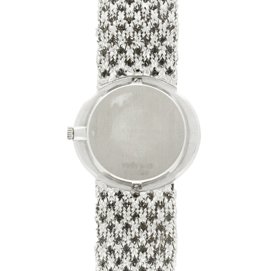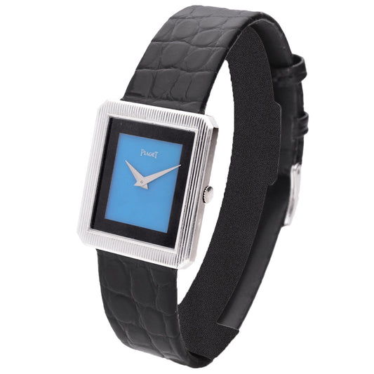 18ct white gold Piaget ref. 9701 bracelet watch with lapis lazuli dial and chapter engraved bezel. Made 1970