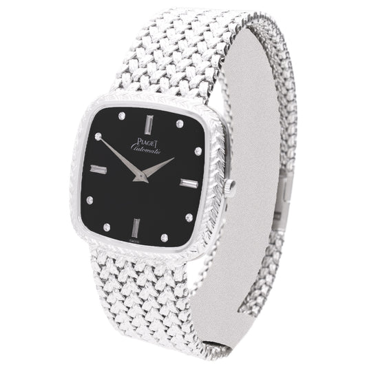 18ct white gold Piaget ref. 12773 automatic bracelet watch with onyx dial and diamond set hour indices. Made 1978