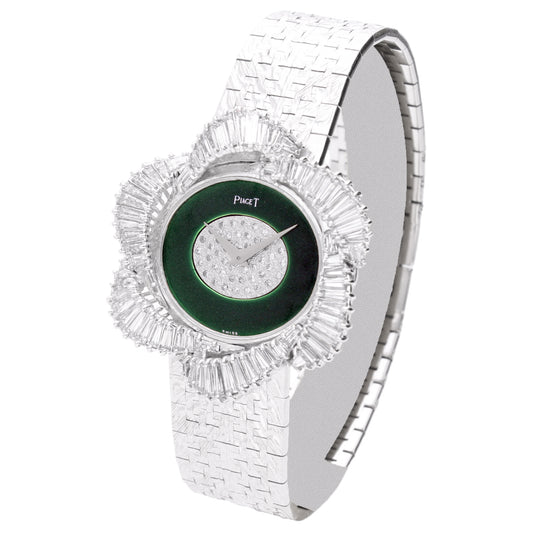 18ct white gold Piaget ref. 9338 diamond and malachite dial with diamond bezel bracelet watch. Made 1970
