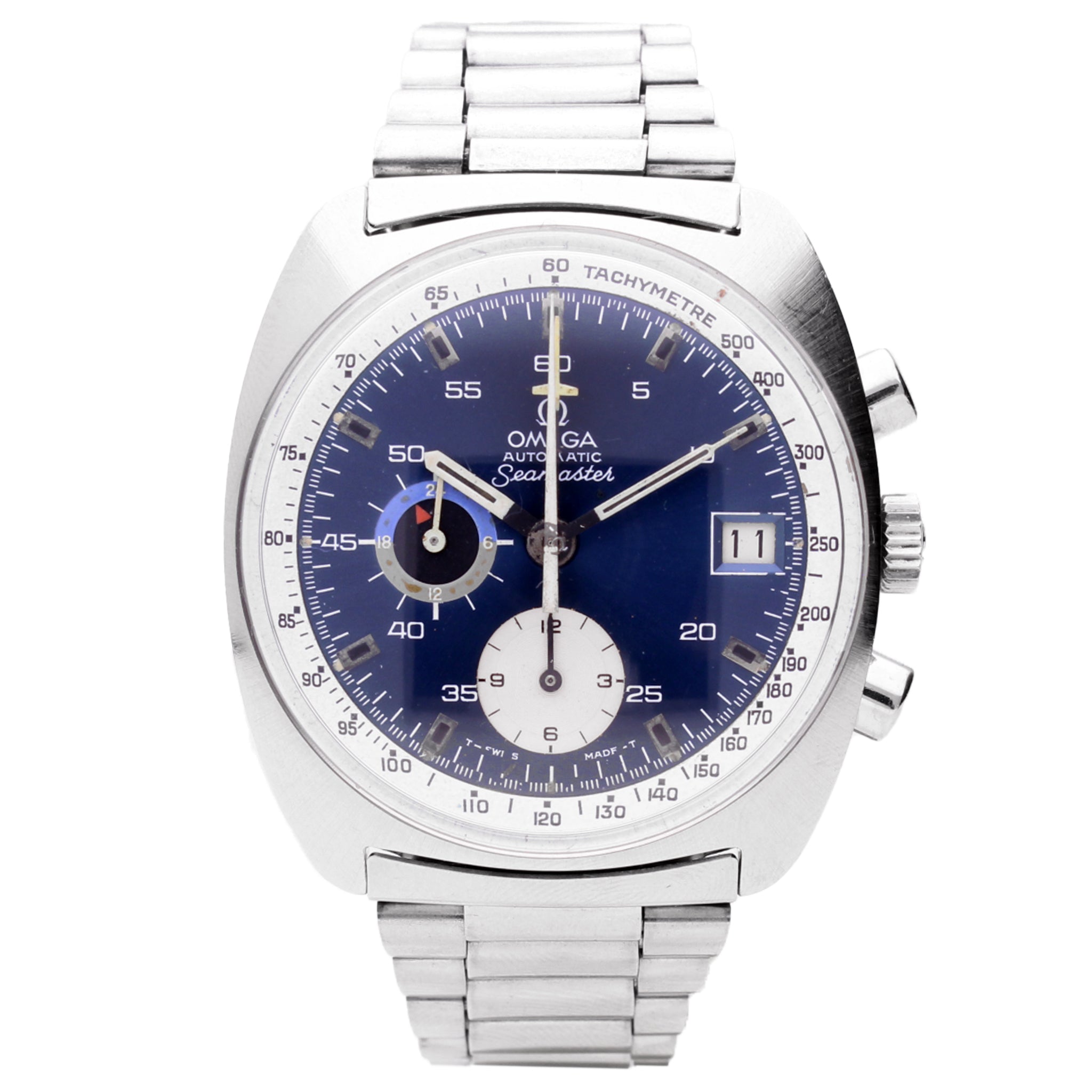 - Dial: Blue dial with white printed outermost 1/5 second divisions featuring date aperture at 3 o'clock, 60 minute register at 6 o’clock and subsidiary seconds at 9 o’clock, White baton, hour and minute hands and pointed arrow chronograph hand with central minute counter hand.